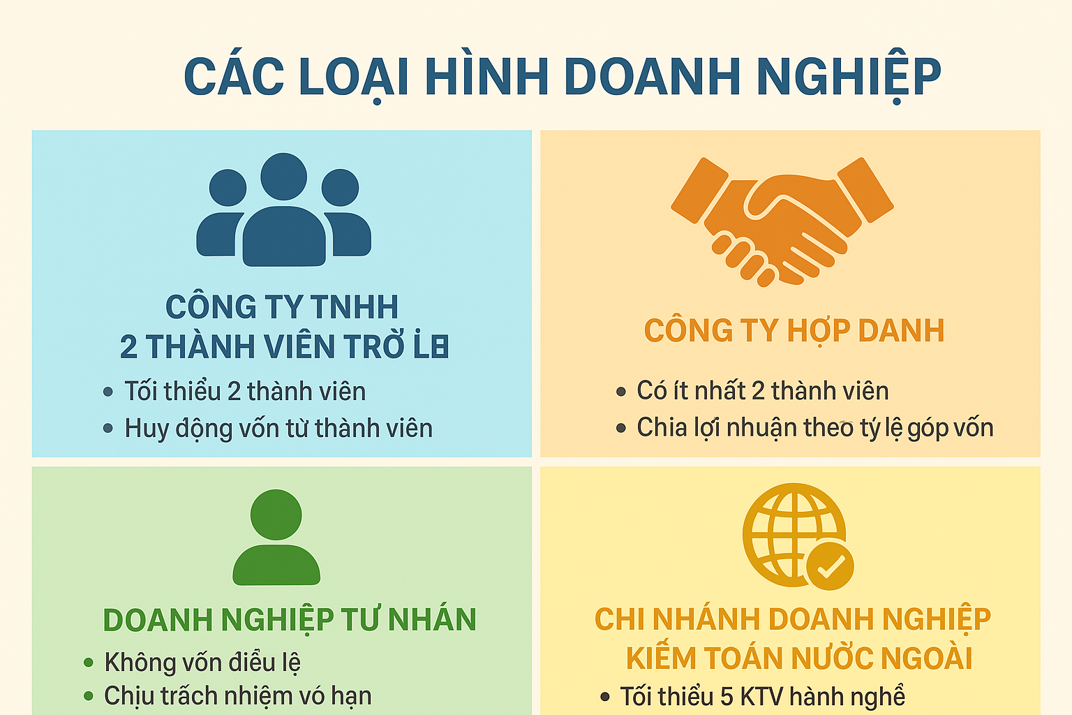 Theo Điều 20 Luật Kiểm toán độc lập 2011, bốn loại hình tổ chức được phép kinh doanh dịch vụ kiểm toán tại Việt Nam bao gồm: